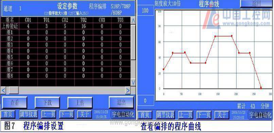 對于518P、708P、808P程序參數(shù)設(shè)置,點(diǎn)擊【A】框,進(jìn)入【手/自動、編程設(shè)置控制平臺】;圖5所示的編程界面:出現(xiàn)【通道一程序編排設(shè)置】;程序編排平臺用組別配方來設(shè)置程序段【C01】和【T01】表示,以【組1】為例:點(diǎn)擊選中【組1】點(diǎn)擊組名【C01】下面的數(shù)據(jù)框輸入溫度值【250】(注:在溫度欄C01輸入的數(shù)值要放大10倍如25℃輸入的數(shù)據(jù)是【250】放大10倍);點(diǎn)擊組名T01下的時間段寫入實(shí)際時間值分鐘如15分鐘寫入【15】;設(shè)置好程序配方選中配方組如:【組1】在菜單條中點(diǎn)擊【查看】可看到已編排的曲線圖形;點(diǎn)擊【返回】;選中編輯好的配方組【組1】點(diǎn)擊【下載】操作,已編排的程序就下傳給程序儀表;即時可操作【運(yùn)行】【停止】【暫停】【手動】【自動】【返回】。采用【上傳驗(yàn)證】儀表中的程序曲線來檢驗(yàn)程序是否下傳,程序配方可保存15組程序在觸摸屏中。圖7
